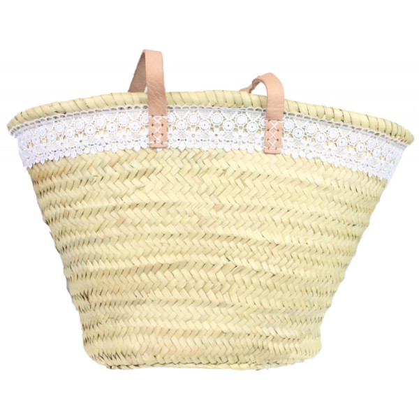 Ce couffin en palmier naturel vous plaira grâce à son style, avec son ruban en dentelle blanche sur un seul côté.