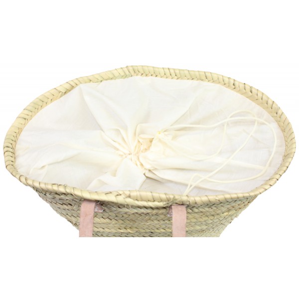 Couffin en palmier naturel, anses bandoulières et tissu intérieur refermable, dentelle blanche